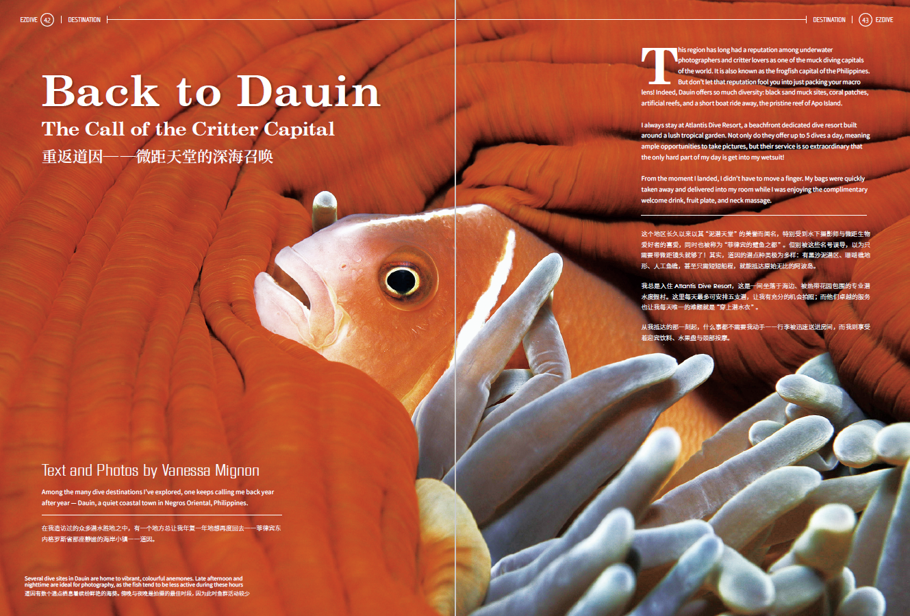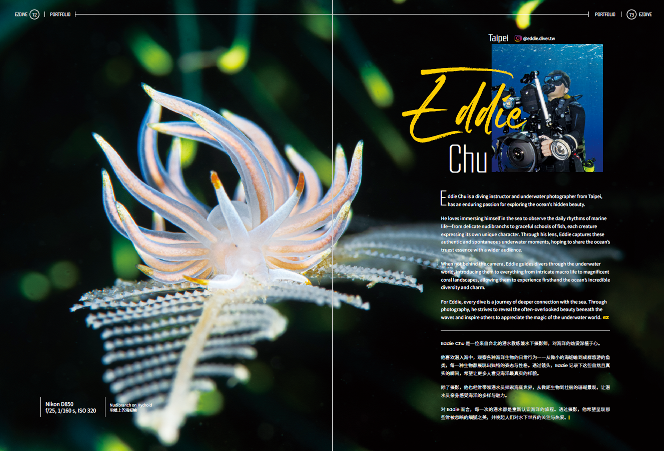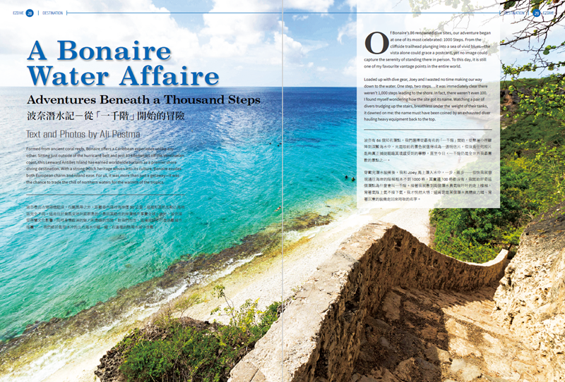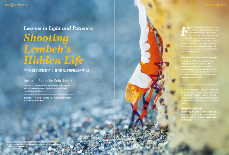 This issue also brings several inspiring dive stories. Ali takes you to Bonaire for a visit to the not-quite ‘Thousand Steps’; Vanessa introduces the year-round diving haven of Dauin; Kate shares practical photography guidance for shooting in Lembeh; and Keigo reveals the mysterious deep-sea world of the unicorn shrimp.