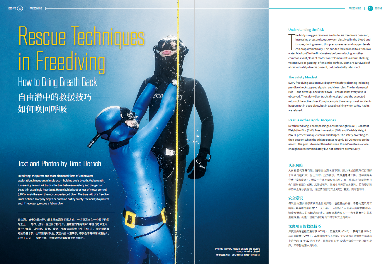 While celebrating the art of underwater photography, Richard reminds us of the importance of responsible diving—no shot is worth harming the ocean or marine life. For freedivers, Timo’s detailed rescue-technique guide will help you become a more reliable dive buddy.