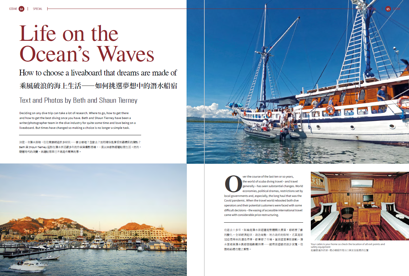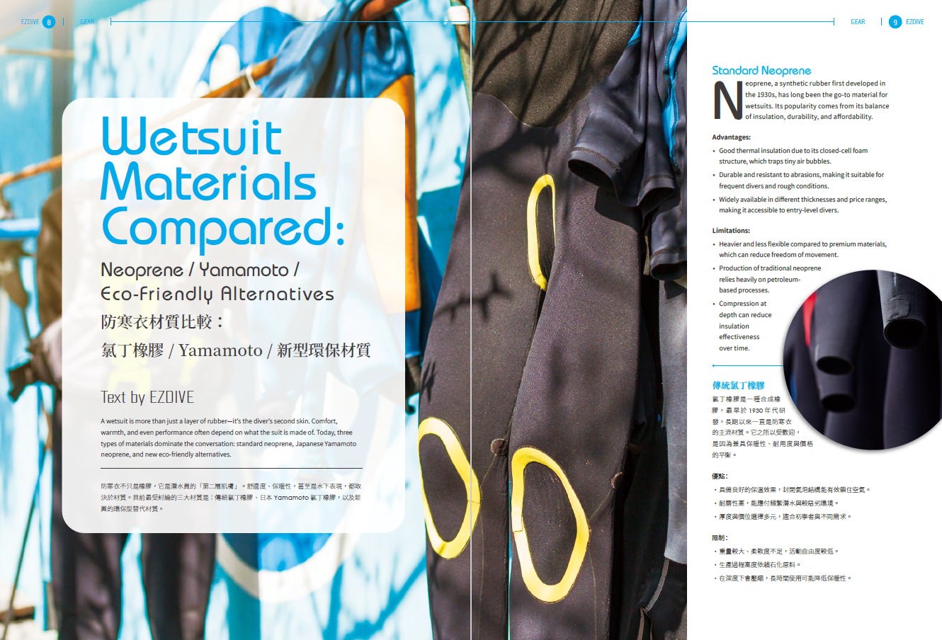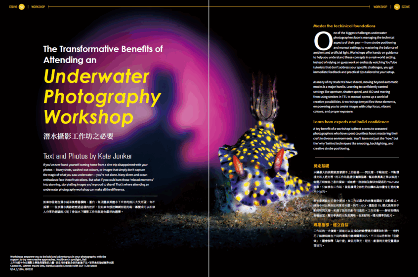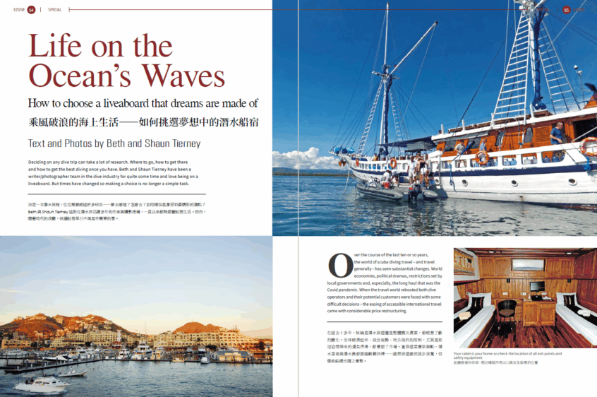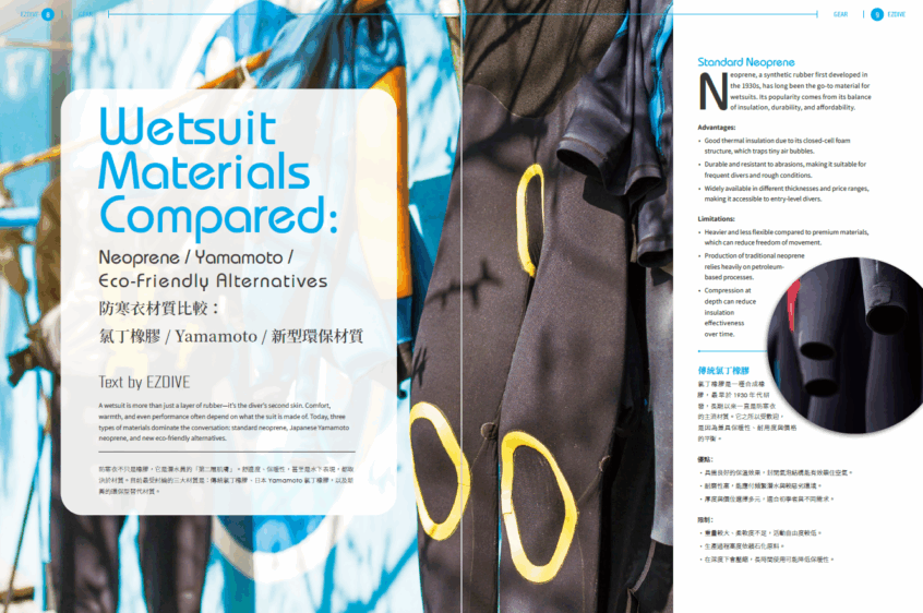 在裝備專欄中,我們為你帶來實用對比:氯丁橡膠、Yamamoto與新型環保材質,幫助你選出最適合自己的防寒衣。而在水下攝影專欄中,Kate分享參加攝影工作坊所帶來的技術與創作躍進;Beth與Shaun這對經驗豐富的潛水搭檔,則分享如何挑選夢想中的潛水船宿,讓你在海上也能安心享受潛旅生活。
