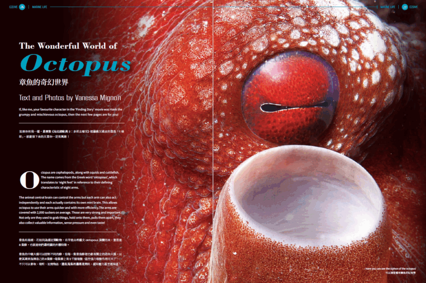 你是否曾凝視過章魚的眼睛?本期封面便是來自Vanessa鏡頭下的章魚特寫。翻開雜誌,一起探索這位水下變形大師的多重面貌——柔軟的身體、複雜的神經系統,以及令人驚嘆的偽裝能力,每一面都展現了海洋生命的驚奇與智慧。